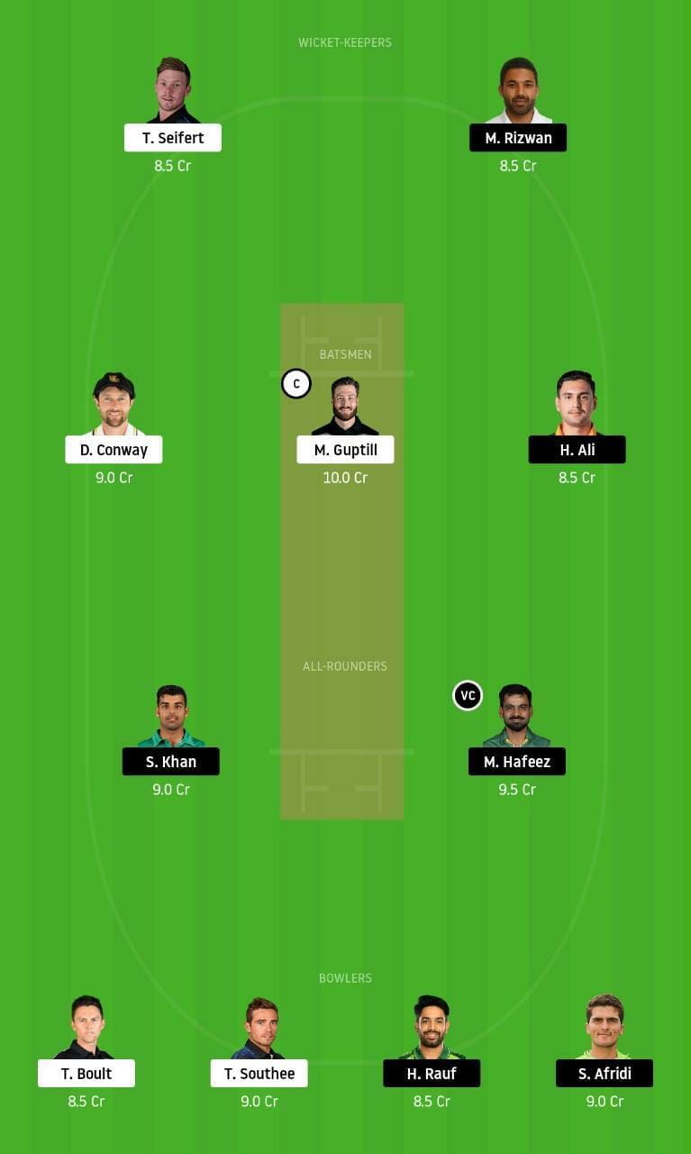 NZ vs PAK Fantasy Suggestion #1: Tim Seifert, Mohd Rizwan, Martin Guptill, Haider Ali, Devon Conway, Mohd Hafeez, Shadab Khan, Tim Southee, Haris Rauf, Shaheen Afridi, and Trent Boult