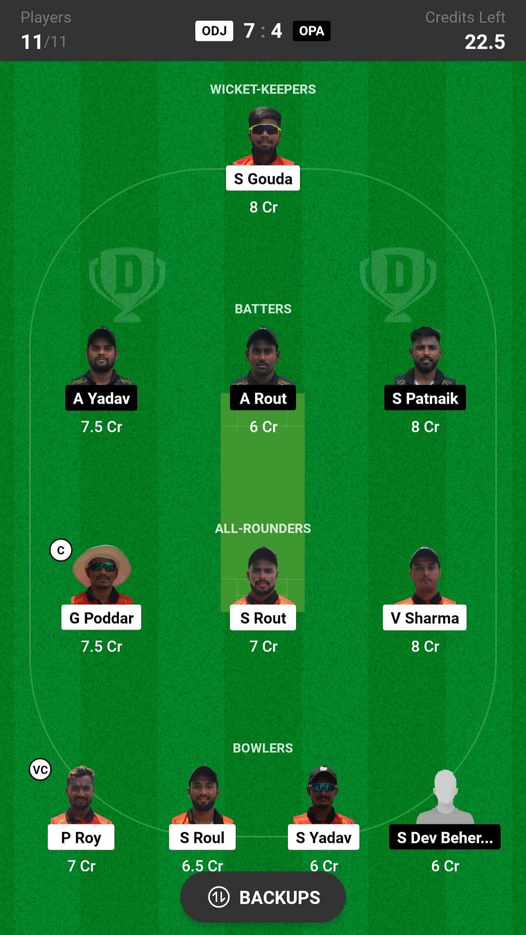 V Sharma and G Poddar are the best all-rounder picks for the Dream11 team as they are batting in the top order and also completing their quota of overs. S Rout is another good pick for today's Dream11 match.