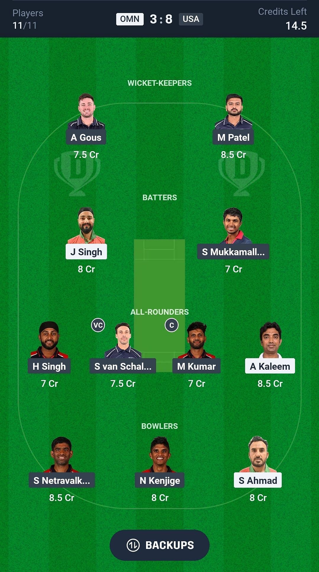 M Kumar is the most crucial pick from the United States of America as the pitch is expected to support both bowlers and batters. He will bat in the top order and bowl a good number of overs in today's match. He has taken 12 wickets and smashed 418 runs in the last eleven matches.