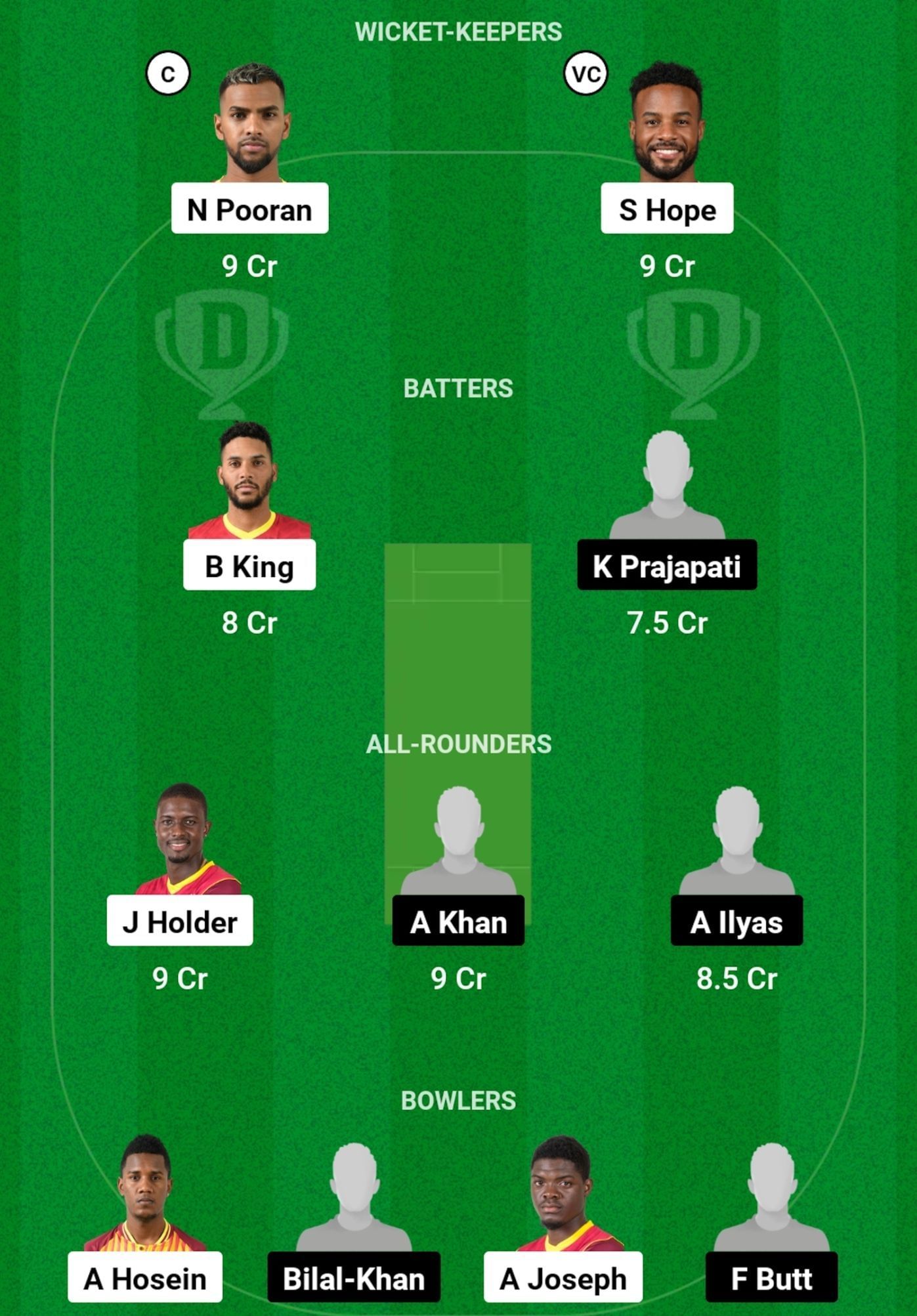 Bowlers: Akeal Hosein, Bilal Khan, Alzarri Joseph, Fayyaz Butt