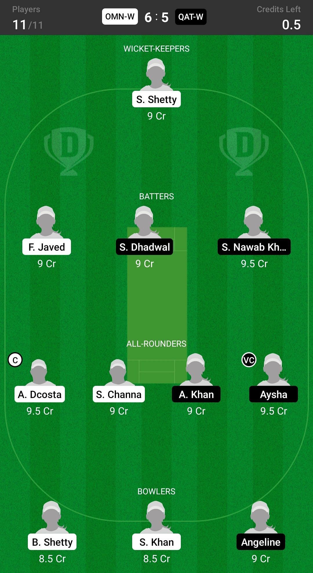 Fantasy suggestion #1: S Shetty, F Javed, S Dhadwal, S Nawab, A Dcosta, Aysha, A Khan, S Channa, S Khan, Angeline, B Shetty