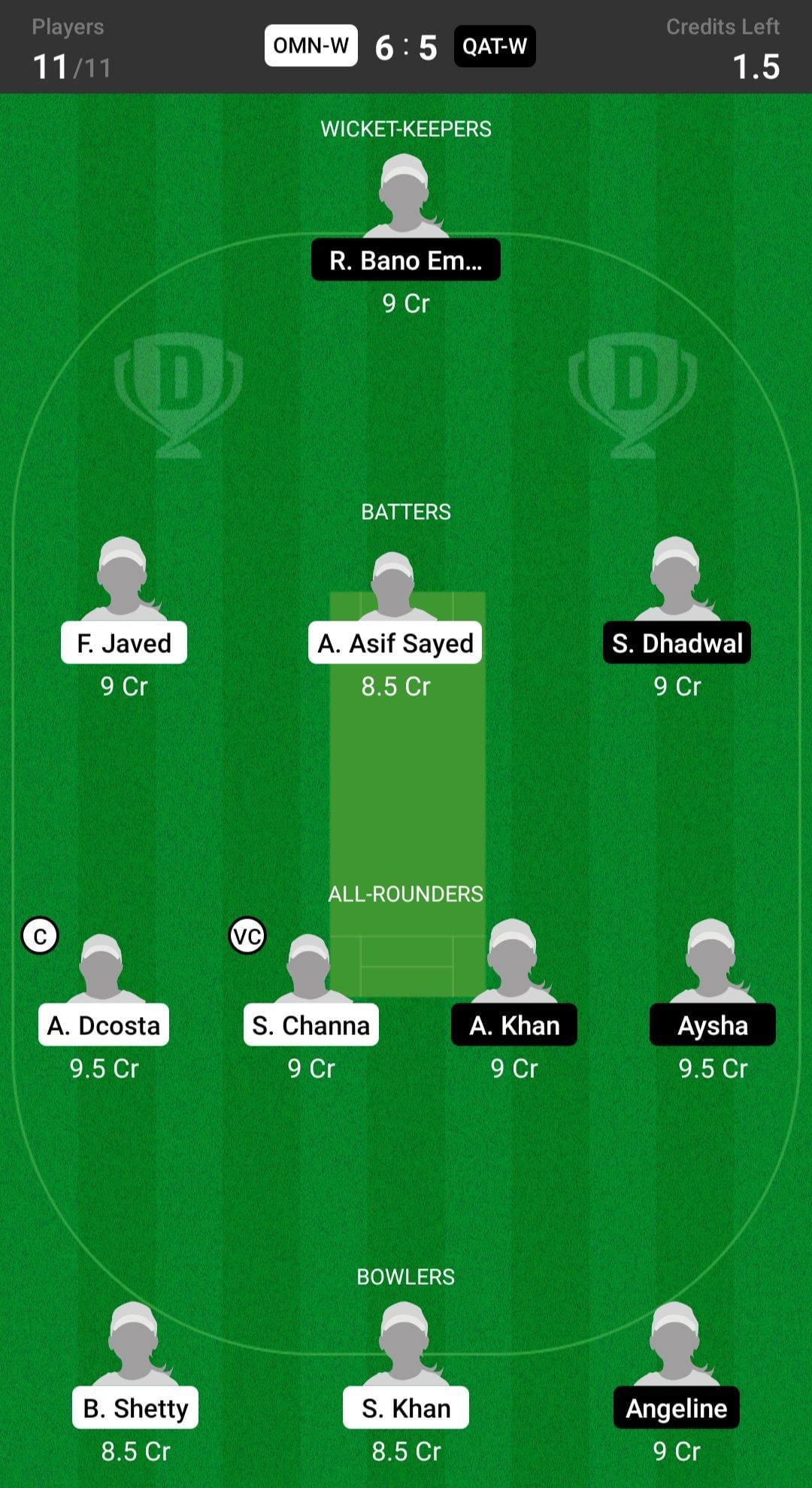 Fantasy suggestion #2: R Bano, F Javed, S Dhadwal, A Asif, A Dcosta, Aysha, A Khan, S Channa, S Khan, Angeline, B Shetty