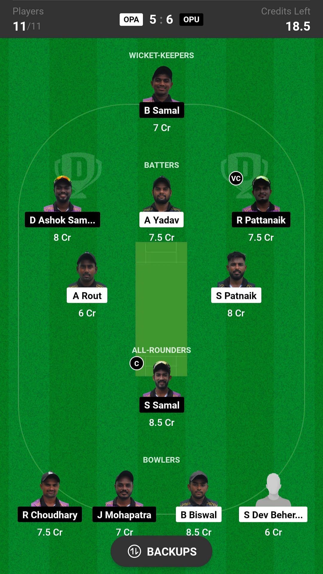 Batters: R Pattanaik, A Yadav, A Rout, S Patnaik, D Ashok