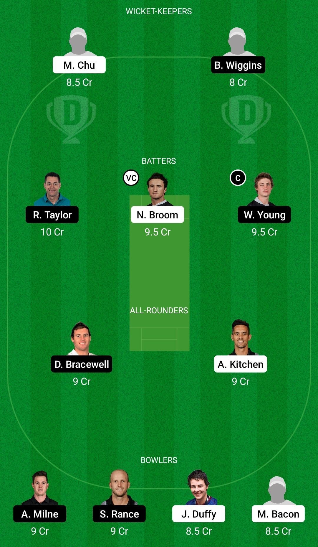 Central Stags: Ben Smith, Bayley Wiggins (wk), Will Young, Ross Taylor, Tom Bruce (c), Josh Clarkson, Doug Bracewell, Adam Milne, Seth Rance, Blair Tickner, Jayden Lennox