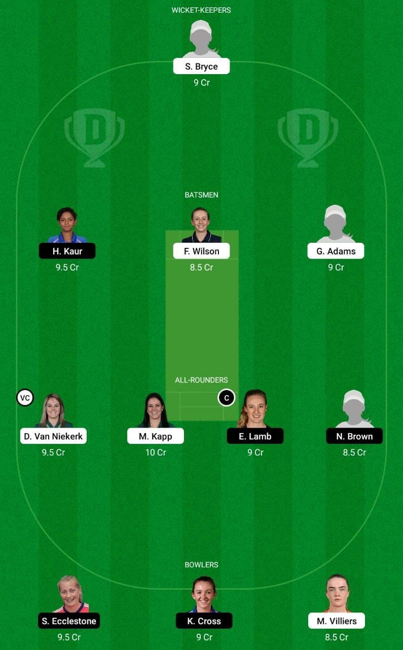 Fantasy Suggestion #1: Sarah Bryce, Harmanpreet Kaur, Georgia Adams, Fran Wilson, Marizanne Kapp, Dane van Niekerk, Emma Lamb, Natalie Brown, Sophie Ecclestone, Kate Cross and Mady Villiers
