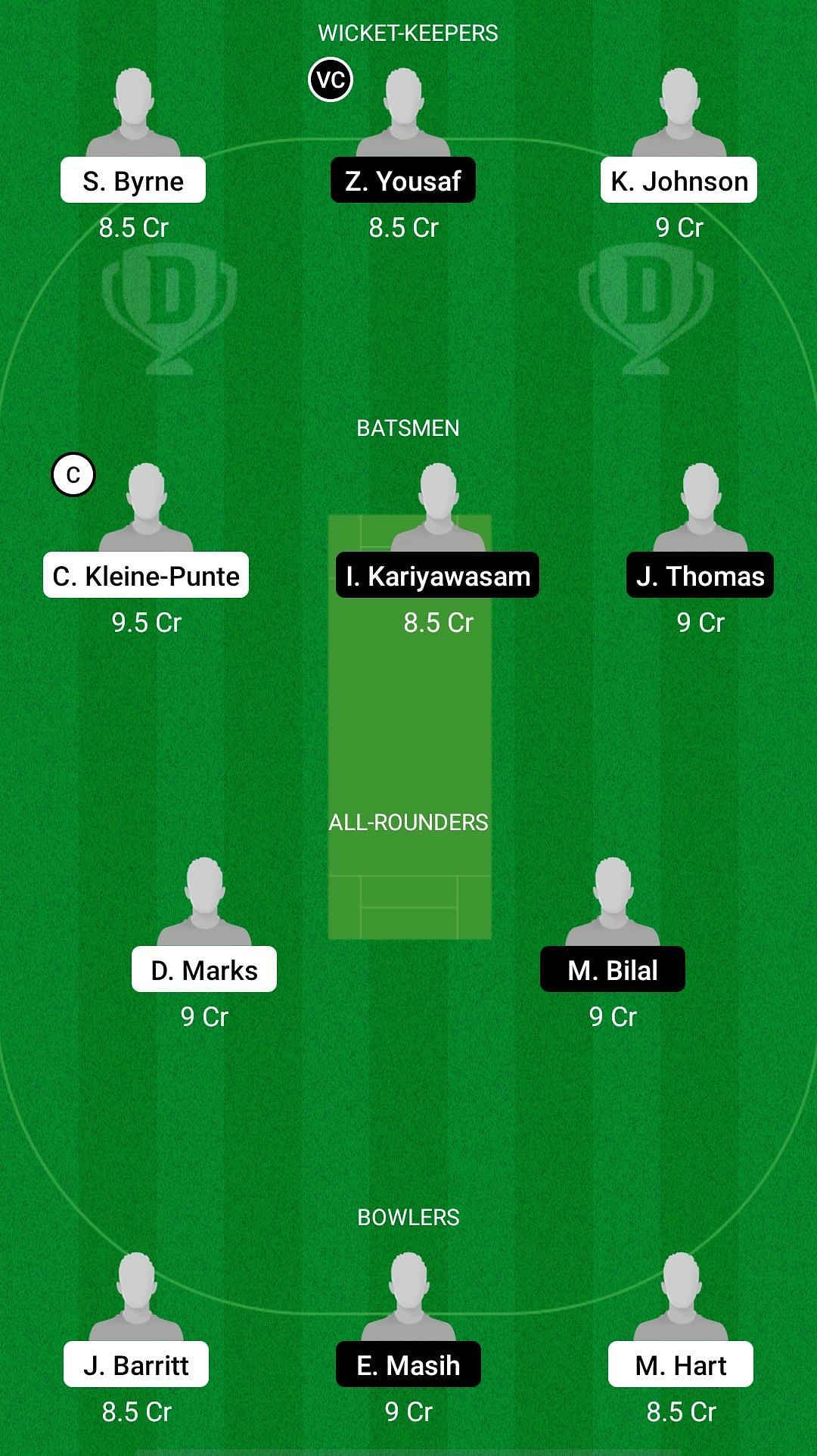 Fantasy Suggestion #1: Sean Byrne, Zeshan Yousaf, Kivian Johnson, Charl Kleine-Punte, Ishantha Kariyawasam, Jojo Thomas, David Marks, Bilal Khan, Jack Barritt, Ezhaq Masih, Michael Hart.