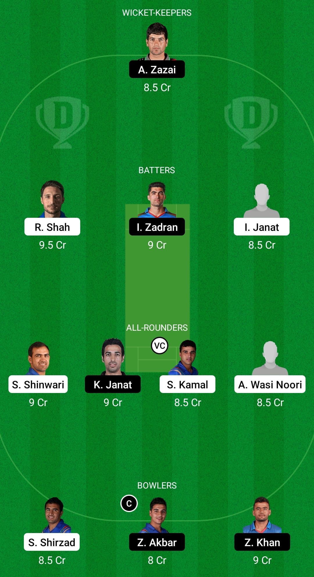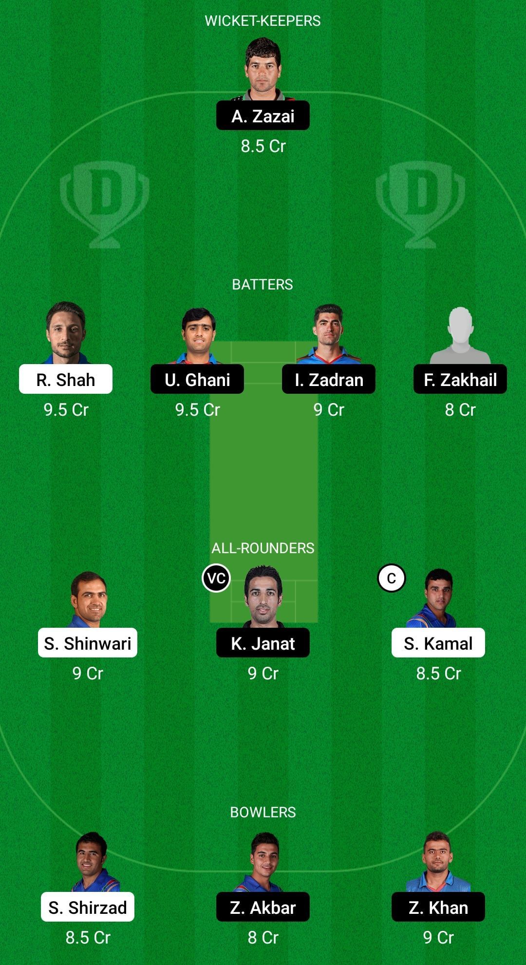 Fantasy Suggestion #1: Afsar Zazai, Rahmat Shah, Usman Ghani, Ibrahim Zadran, Farhan Zakhail, Samiullah Shinwari, Karim Janat, Shahidullah Kamal, Sayed Shirzad, Zia-ur-Rehman, Zahir Khan.