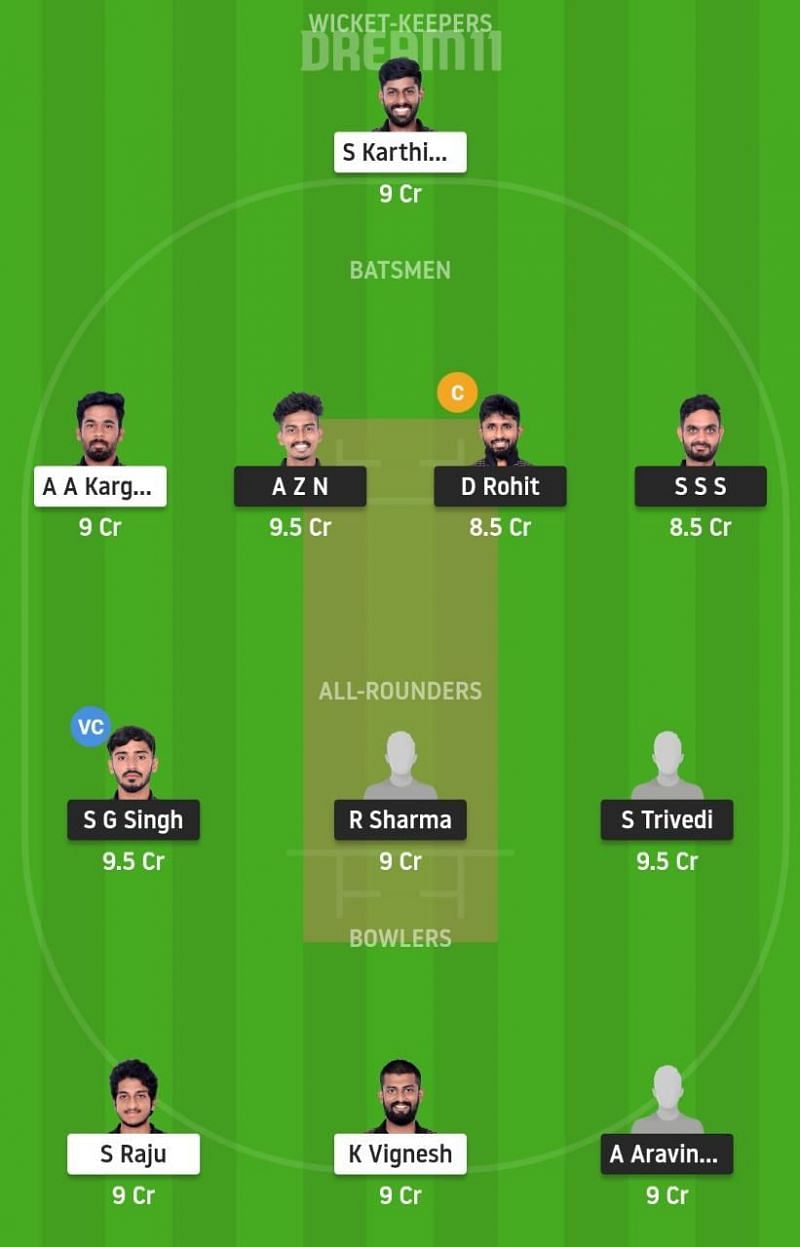 Fantasy Suggestion #1: S Karthik-II, D Rohit, Ameer Zeeshan N, Shivam Singh N, A A Kargave, Sidak Gurvinder Singh, Sagar Trivedi, Raghu Sharma, A Aravindraj, K Vignesh, S Raju.