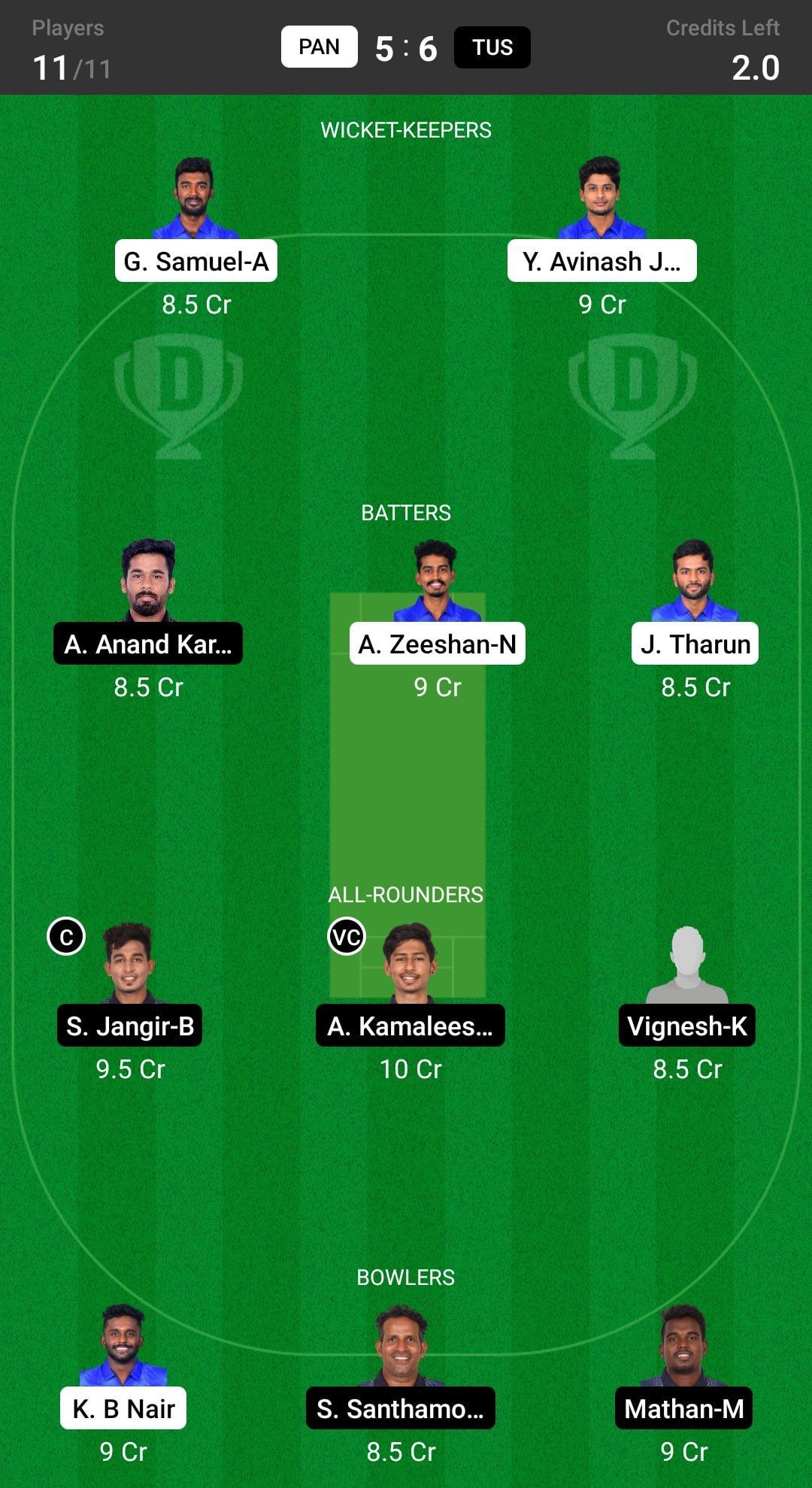 Fantasy suggestion #2: G Samuel, Y Avinash, A Anand, J Tharun, A Zeeshan, S Jangir, A Kamaleeshwaran, K Vignesh, KB Nair, M Mathan, S Santhamoorthy