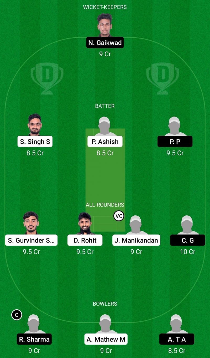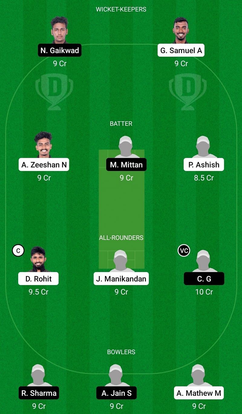 Fantasy Suggestion #1: Nipun Gaikwad, George Samuel A, Ameer Zeeshan N, Mohit Mittan, Priyam Ashish, D Rohit, Jayaprakash Manikandan, G Chiranjeevi, Raghu Sharma, Akshay Jain S, Abin Mathew
