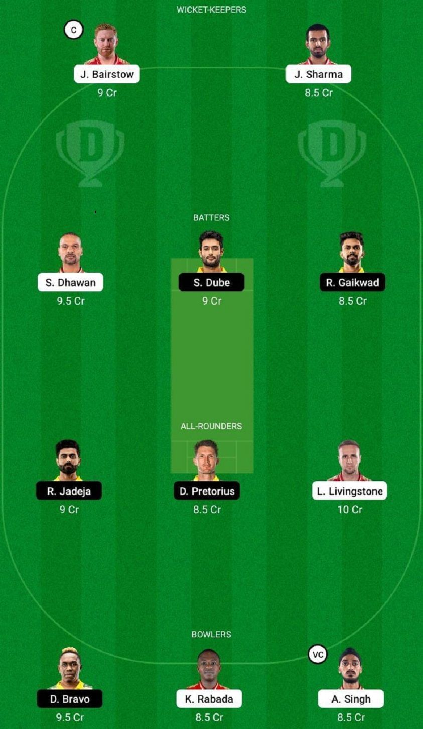 Fantasy Suggestion #2: Jonny Bairstow, Shikhar Dhawan, Shivam Dube, Jitesh Sharma, Ruturaj Gaikwad, Ravindra Jadeja, Dwaine Pretorius, Liam Livingstone, Dwayne Bravo, Kagiso Rabada and Arshdeep Singh.