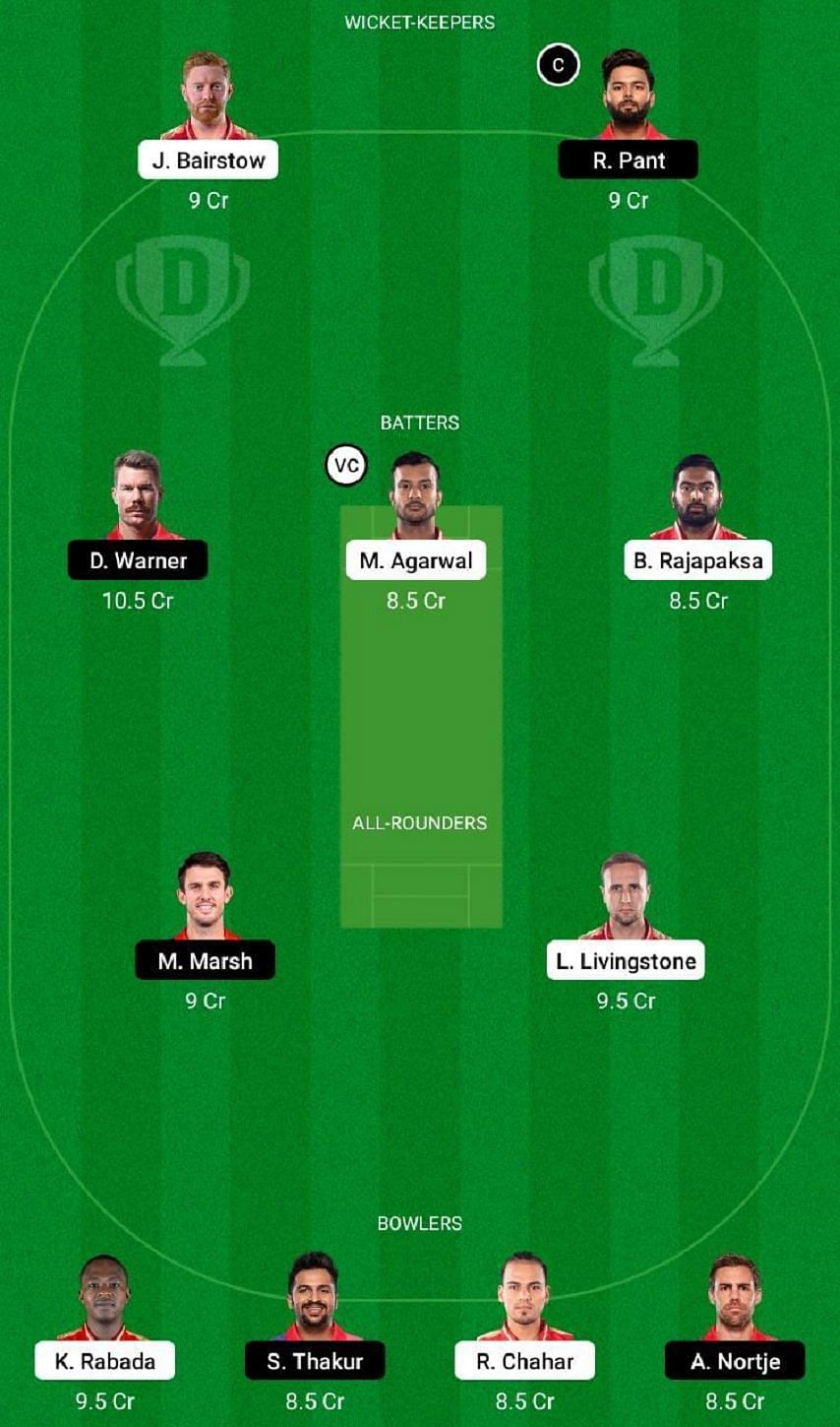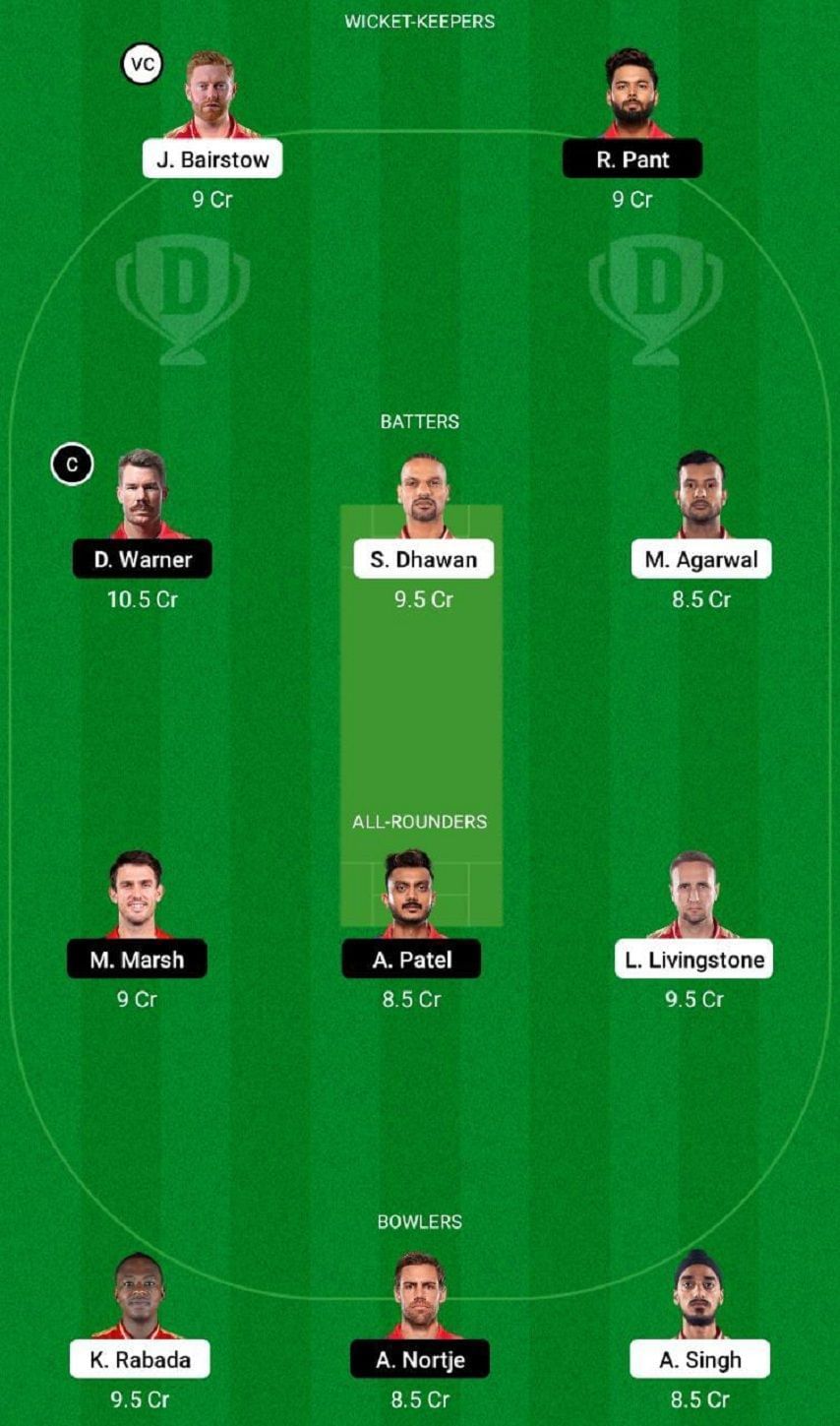 Fantasy Suggestion #1: Jonny Bairstow, Rishabh Pant, David Warner, Shikhar Dhawan, Mayank Agarwal, Mitchell Marsh, Axar Patel, Liam Livingstone, Kagiso Rabada, Anrich Nortje and Arshdeep Singh.