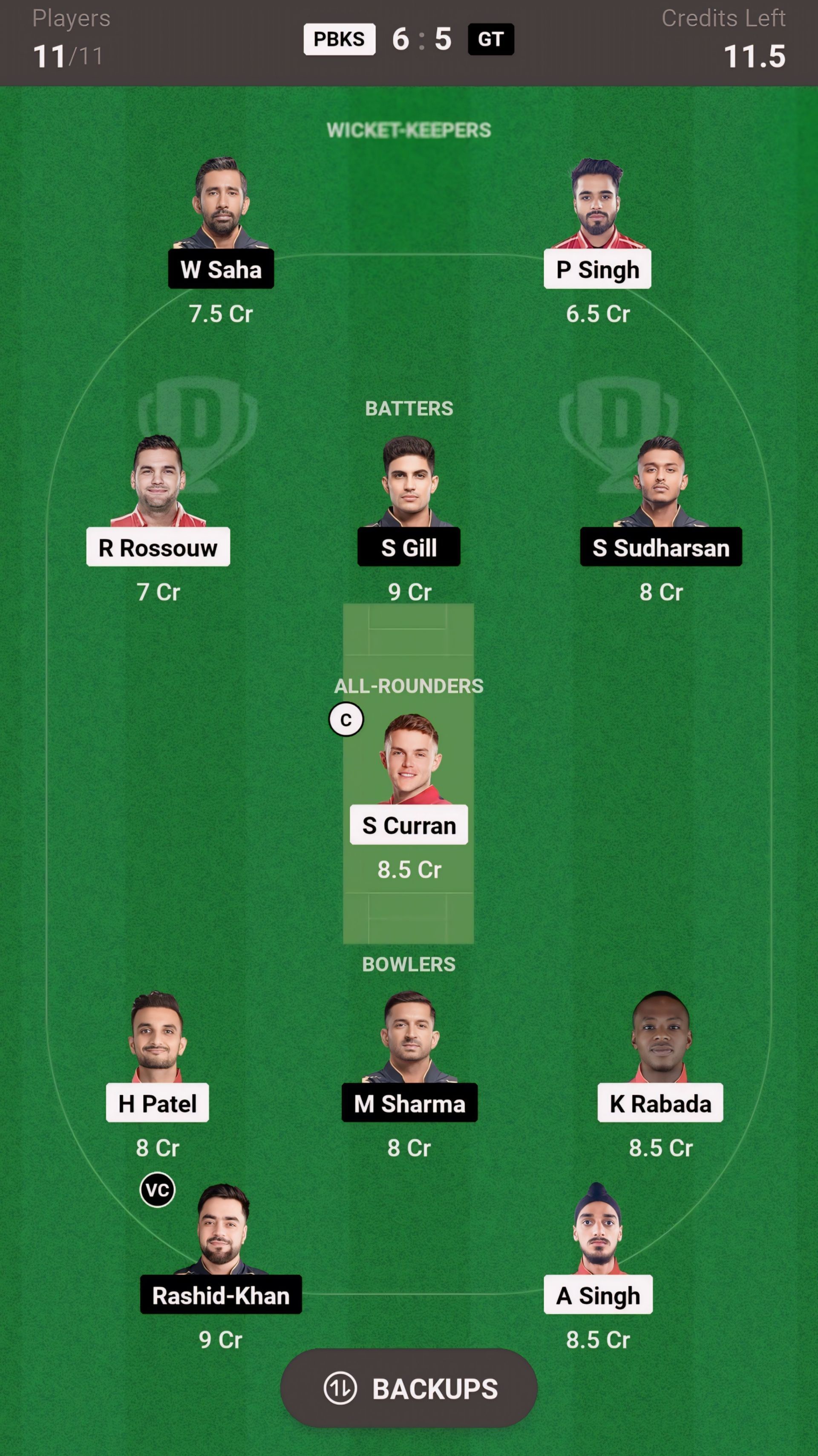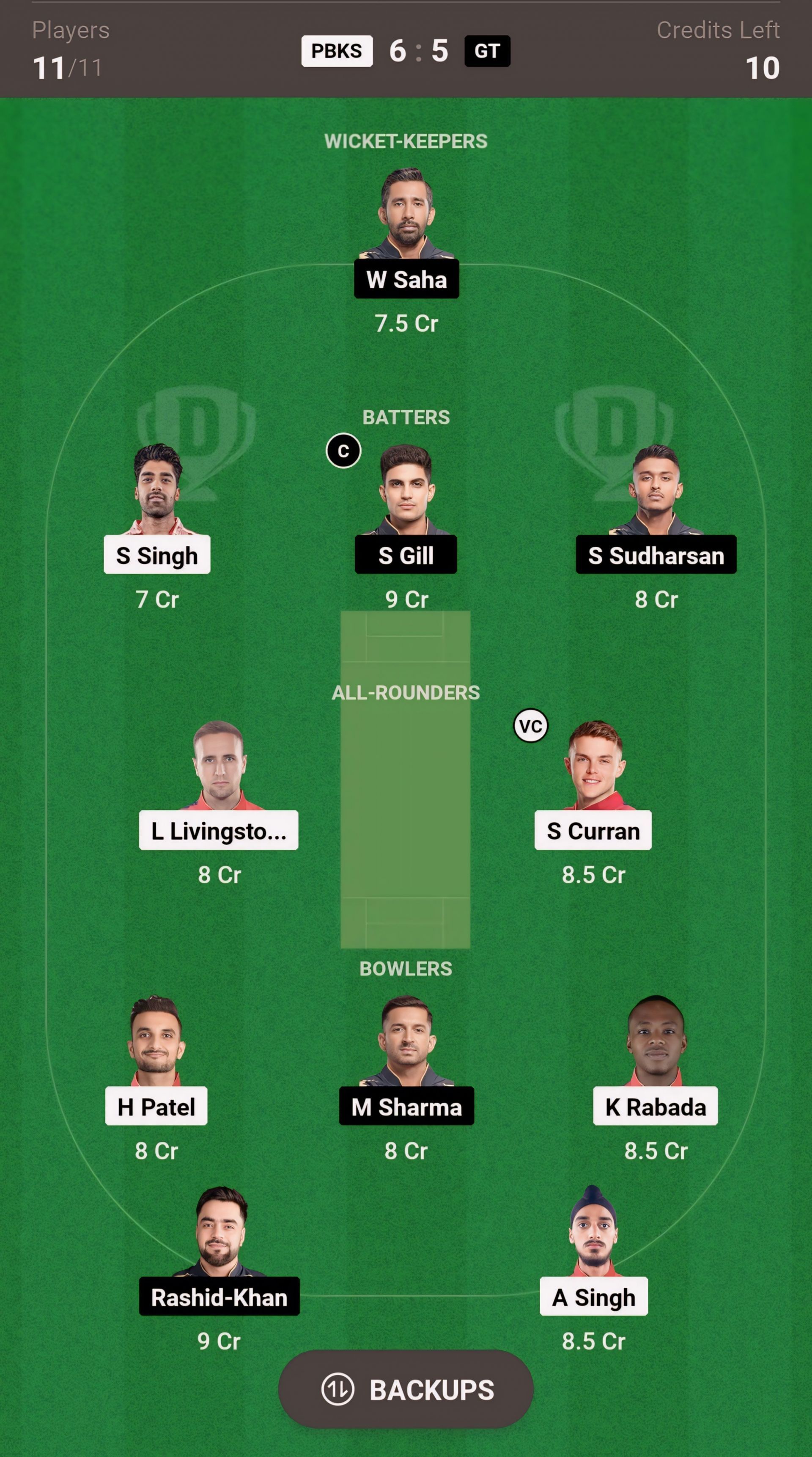 Prabhsimran Singh, Sam Curran (c), Liam Livingstone, Jitesh Sharma (wk), Shashank Singh, Harpreet Brar, Harshal Patel, Arshdeep Singh, Kagiso Rabada, Ashutosh Sharma, Harpreet Singh, Rilee Rossouw
