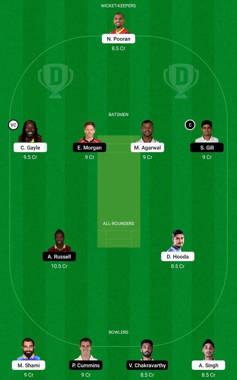 Fantasy Suggestion #1: Nicholas Pooran, Chris Gayle, Eoin Morgan, Mayank Agarwal, Shubman Gill, Andre Russell, Deepak Hooda, Mohammed Shami, Pat Cummins, Varun Chakravarthy and Arshdeep Singh