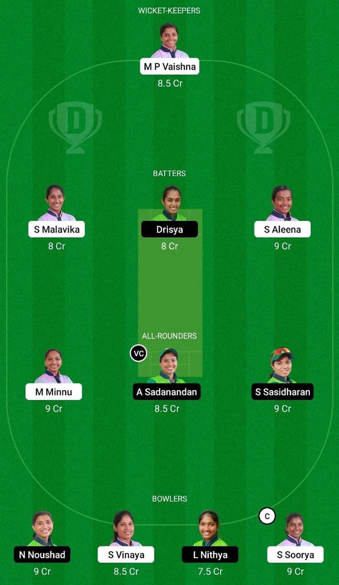 Minnu Mani (c), Alka A Suresh, Vaishna M P (wk), Malavika Sabu, Aleena M P, Arya Baby, Aleena Shibu, Soorya Sukumar, Ragi Mohan, Sneha K R, and Vinaya Surendran.