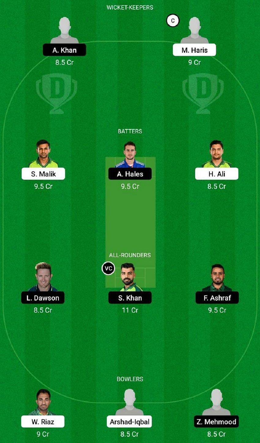 Fantasy Suggestion #1: Azam Khan, Mohammad Haris, Shoaib Malik, Alex Hales, Haider Ali, Liam Dawson, Shadab Khan, Faheem Ashraf, Wahab Riaz, Arshad Iqbal and Zahid Mehmood