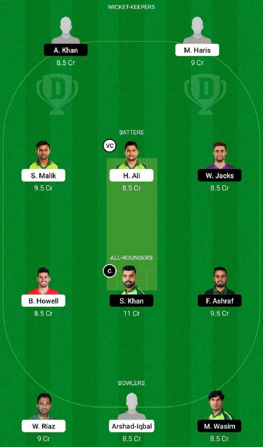 Fantasy Suggestion #2: Azam Khan, Mohammad Haris, Shoaib Malik, Will Jacks, Haider Ali, Benny Howell, Shadab Khan, Faheem Ashraf, Wahab Riaz, Arshad Iqbal and Mohammad Wasim Jr