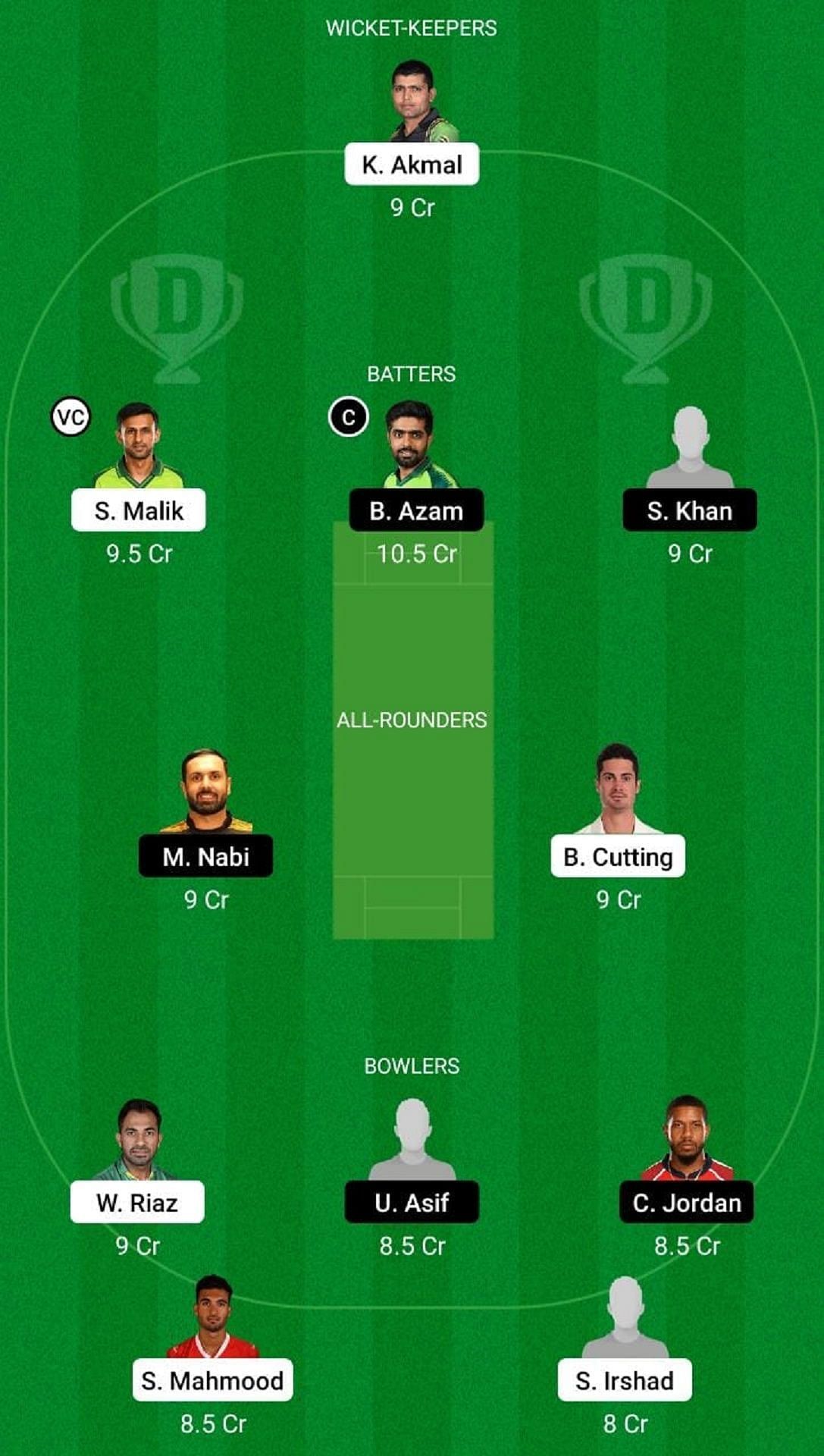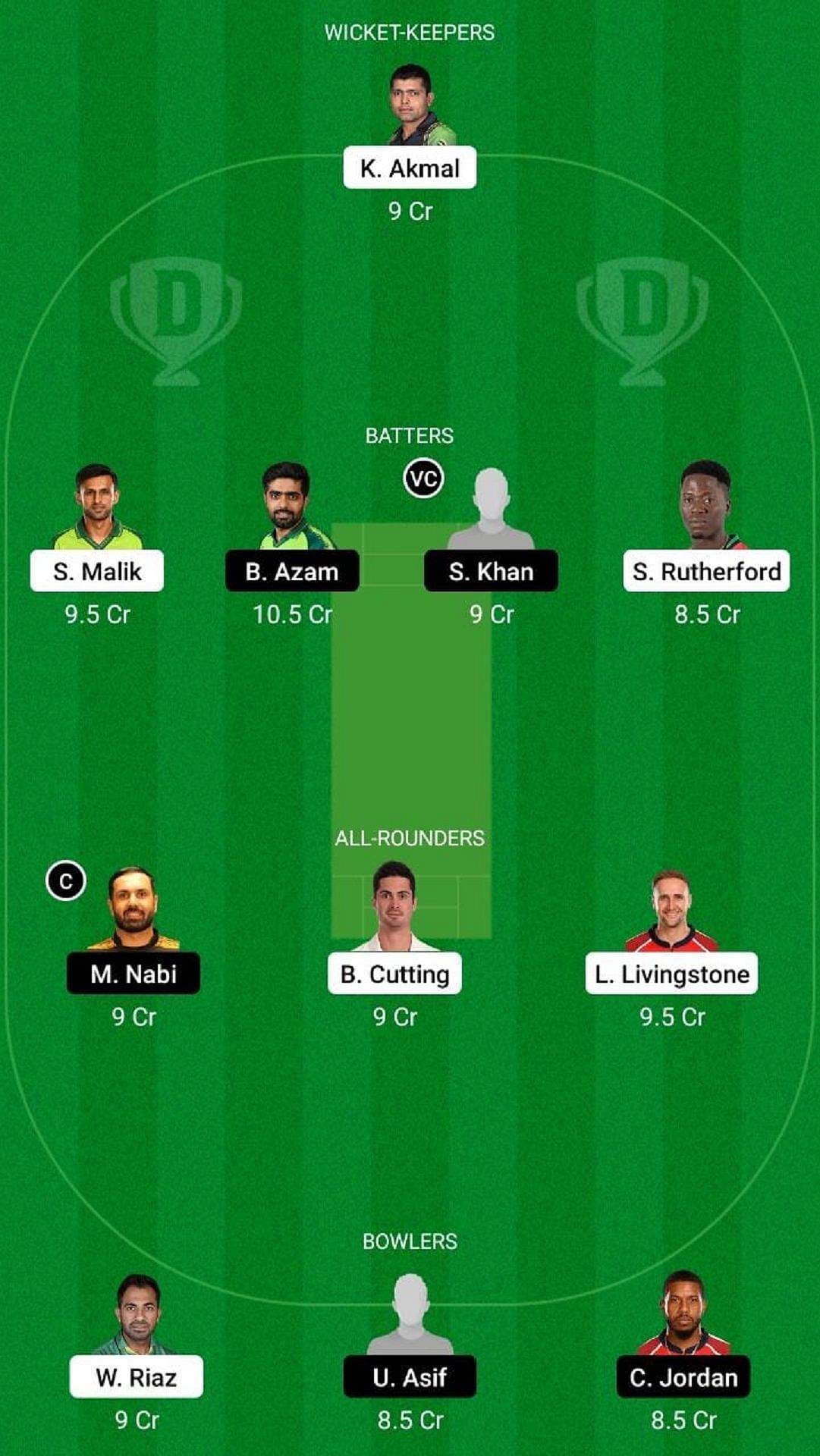 Fantasy Suggestion #2: Kamran Akmal, Shoaib Malik, Babar Azam, Sherfane Rutherford, Sharjeel Khan, Mohammad Nabi, Ben Cutting, Liam Livingstone, Umaid Asif, Wahab Riaz, Chris Jordan