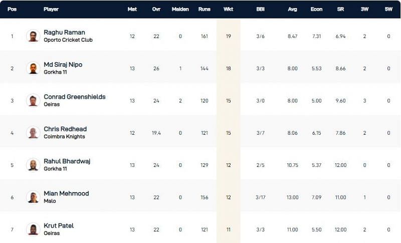 Raghu Raman of Oporto Cricket Club, with 19 scalps, continues to be the highest wicket-taker of the Portugal T10 League 2021. He had a spell of 3/6 as his best performance and had a decent economy of 7.31.