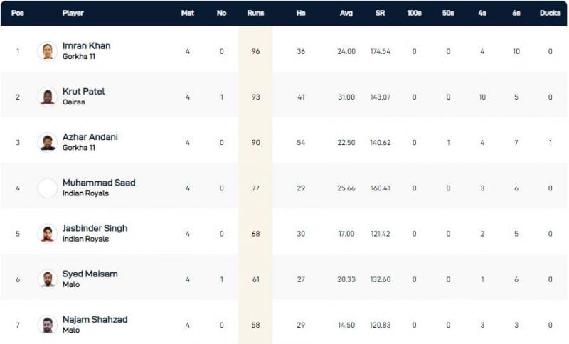 Imran Khan of Gorkha 11 continues to be the highest run-scorer after the fifth day of action in the Portugal T10 League 2021. He has smashed 96 runs in four encounters, with 36 being his top score. Khan has an impressive strike rate of 174.54, and has struck four boundaries and ten sixes.