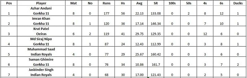 Imran Khan, also from Gorkha 11, is placed second on the run-scoring charts. He has amassed 120 runs thus far, with 36 being his top score. Khan has scored these runs at a decent strike rate of 146.34, with the help of 7 fours and 10 maximums.