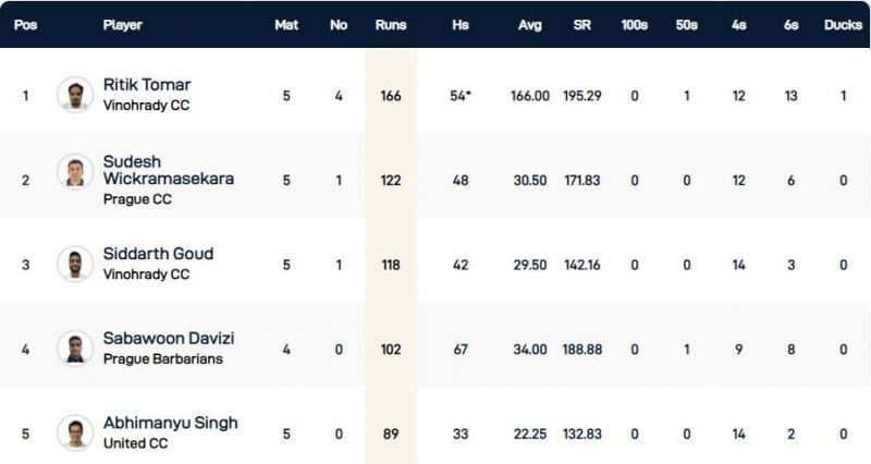 Sudesh Wickramasekara of Prague CC occupies the second spot in the list of highest run-getters with 122 runs to his name. He has a 48-run knock as his top score. Wickramasekara also has an impressive strike rate of 171.83, with his runs consisting of 12 fours and 6 maximums.
