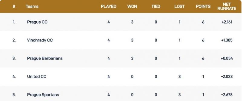 Prague CC, Vinohrady CC and Prague Barbarians occupied the top three positions in the points table of the Prague T10 League 2020 after the conclusion of the group stage. All the three teams had 6 points each and were placed in that order based on net run rate.