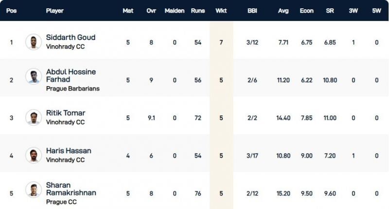 Hassan of Vinohrady CC and Ramakrishnan of Prague CC have spells of 3/17 and 2/12 as their best bowling efforts. But the duo has been slightly on the expensive side, with economy rates of 9.00 and 9.50 respectively.