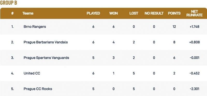Following are the team standings in the two groups after the seventh day of matches in the Prague T10 League 2021: