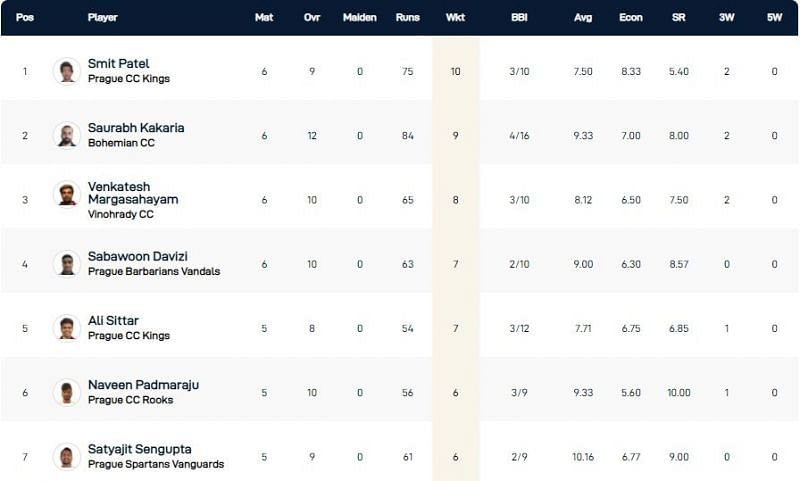 Smit Patel of the Prague CC Kings, with ten scalps to his credit, has emerged as the highest wicket-taker after Day 7 of the Prague T10 League 2021. He has a best spell of 3/10 and has an acceptable economy of 8.33.