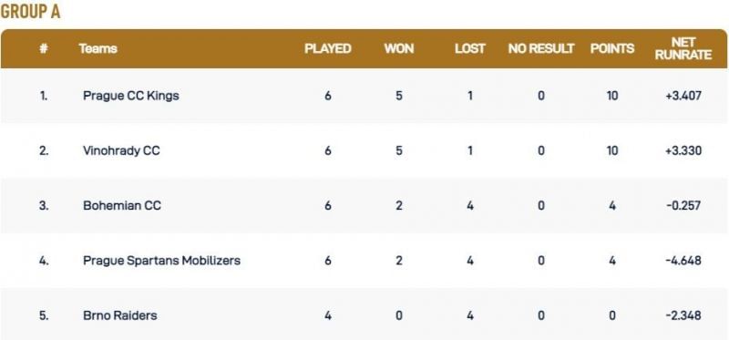 Prague CC Kings and Vinohrady CC, with 10 points apiece, occupy the top two spots in the Group A points table of the Prague T10 League 2021. Both teams have won five of their six matches, with the former having a slightly better net run rate.