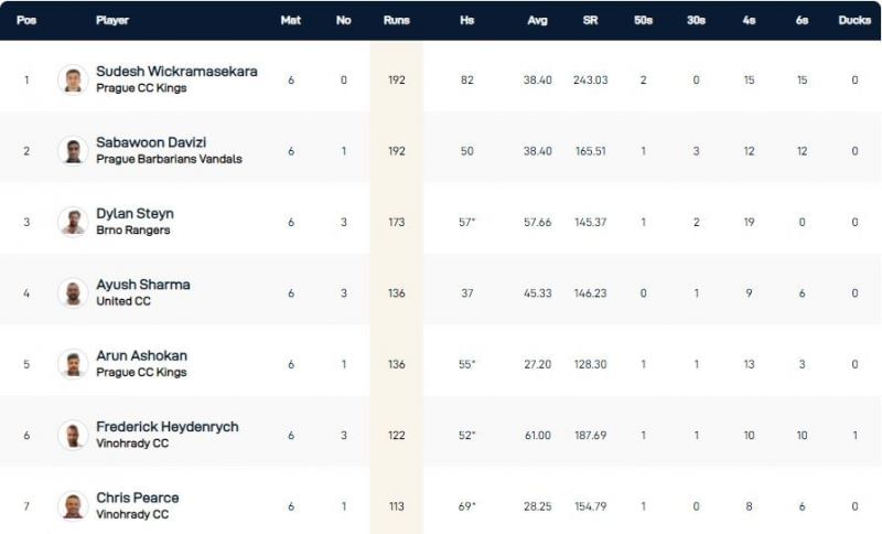 Sudesh Wickramasekara of the Prague CC Kings and Sabawoon Davizi of the Prague Barbarians Vandals are the joint-highest run-scorers after the seventh day of action in the Prague T10 League 2021. Both batsmen have amassed 192 runs thus far, with the former placed higher due to his superior strike rate.