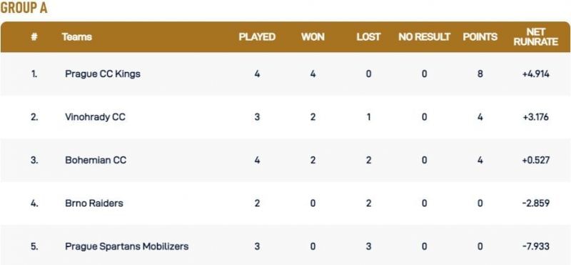 Vinohrady CC and Bohemian CC, with four points each, follow the table-toppers in the standings. The former are placed higher due to their much superior net run rate.