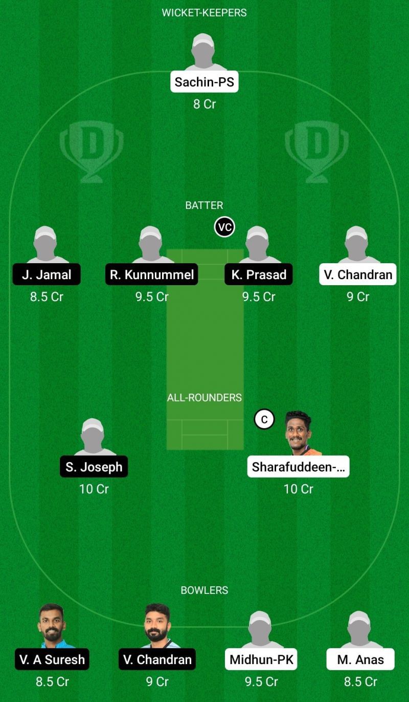 Fantasy Suggestion #2: Sachin PS, Jafar Jamal, Rohan Kunnummal, Krishna Prasad, Vyshak Chandran, Sijomon Joseph, Sharafuddeen NM, Vishweshwar A Suresh, Vaisakh Chandran, Midhun P K, Mohmmed Anas