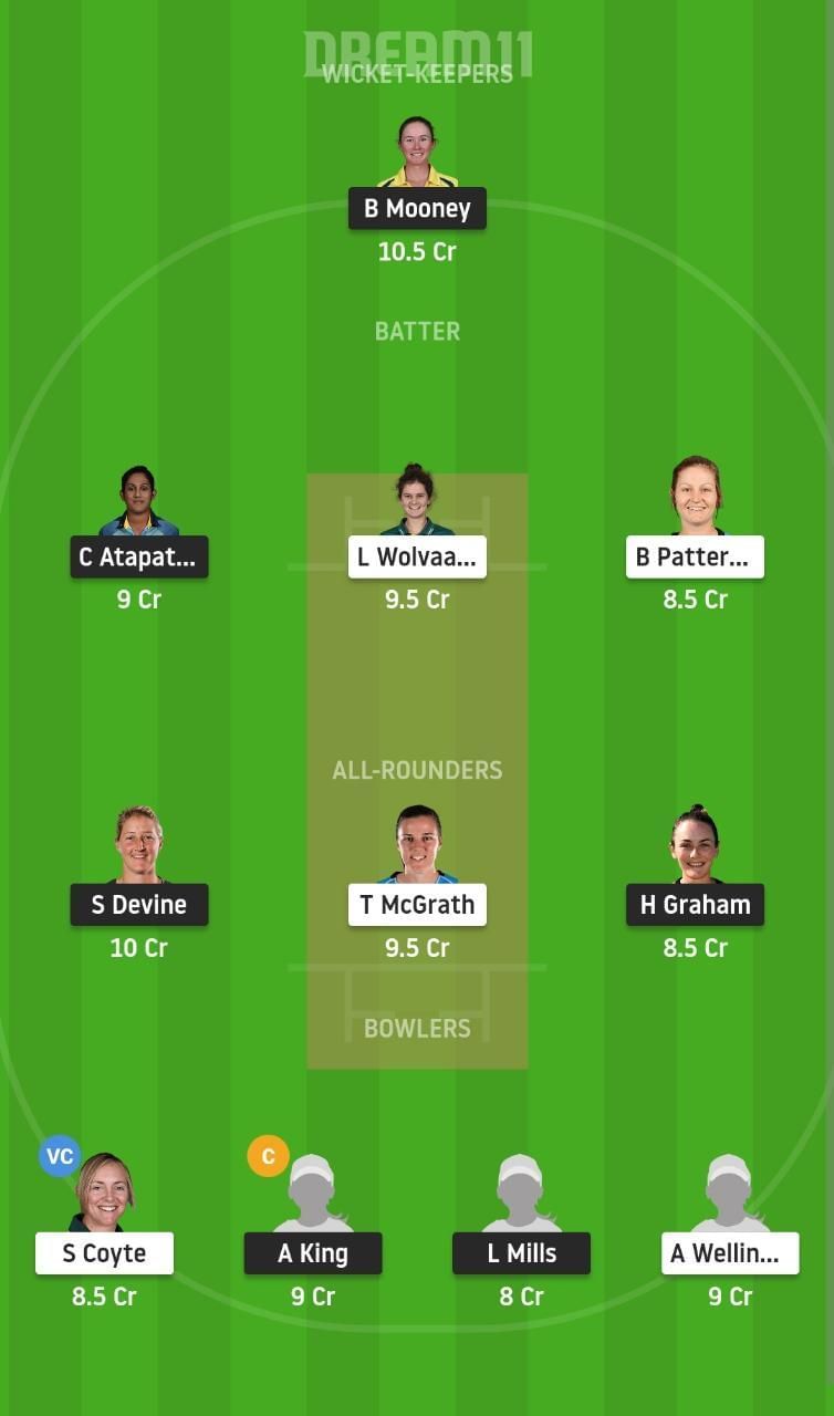 Fantasy Suggestion #1: Beth Mooney, Laura Wolvaardt, Chamari Atapattu, Bridget Patterson, Sophie Devine, Tahila McGrath, Heather Graham, Alana King, Sarah Coyte, Darcie Brown, Lilly Mills