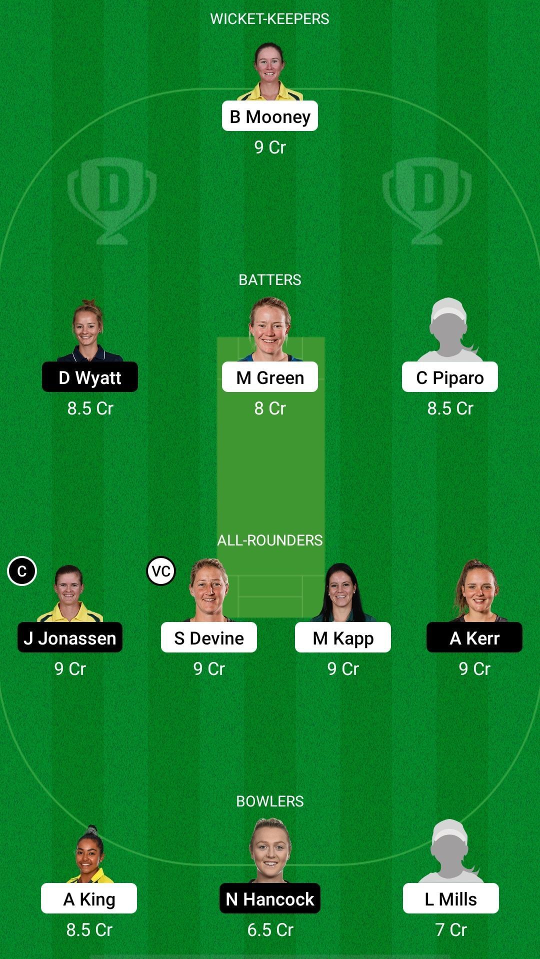Georgia Redmayne (WK), Danielle Wyatt, Laura Kimmince, Georgia Voll, Ellie Johnston, Jess Jonassen, Amelia Kerr, Pooja Vastrakar, Charli Knott, Courtney Sippel, Nicola Hancock.