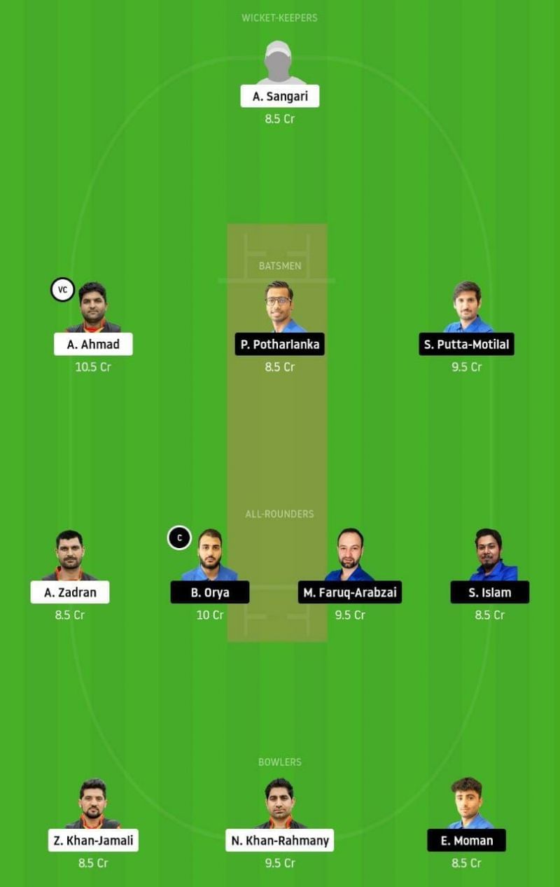 Fantasy Suggestion #1: A Sangari, A Ahmad, S Putta-Motilal, P Potharlanka, B Orya, M Faruq-Arabzai, A Zadran, S Islam, N Khan-Rahmany, Z Khan-Jamali and E Moman