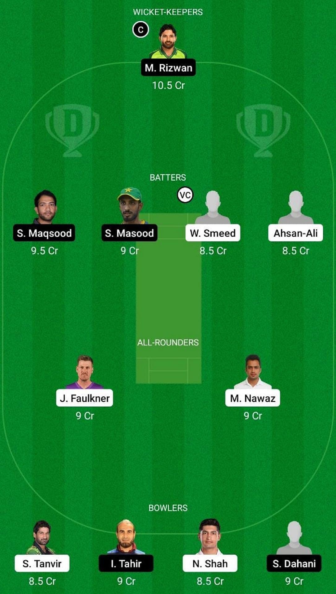 Shan Masood, Mohammad Rizwan (c & wk), Sohaib Maqsood, Rilee Rossouw, Tim David, Khushdil Shah, David Willey, Imran Khan, Imran Tahir, Shahnawaz Dahani, Ihsanullah