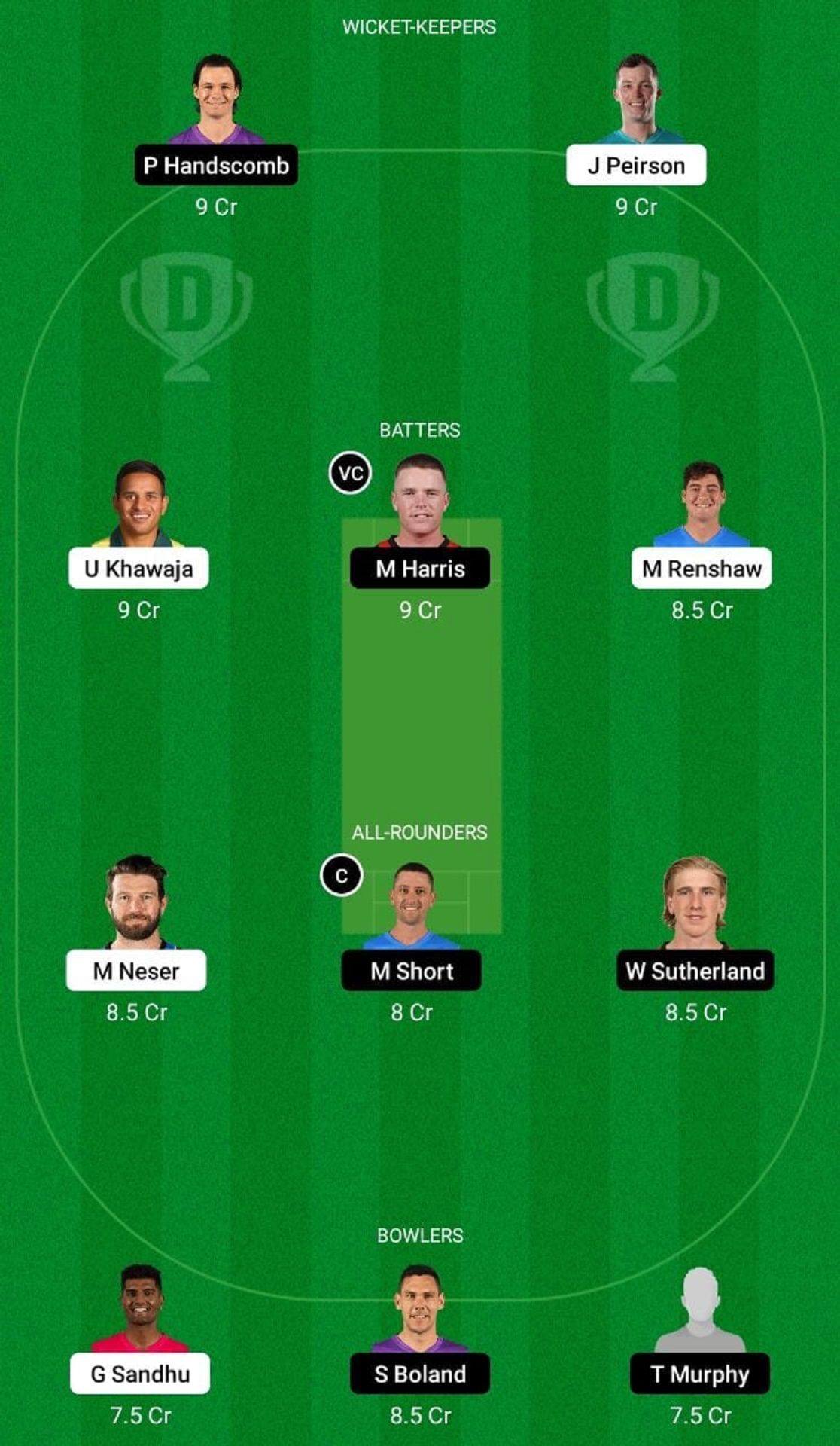 Marcus Harris, Travis Dean, Ashley Chandrasinghe, Peter Handscomb (c), Nic Maddinson, Matthew Short, Sam Harper (wk), Fergus O'Neill, Mitchell Perry, Scott Boland, and Cameron McClure.
