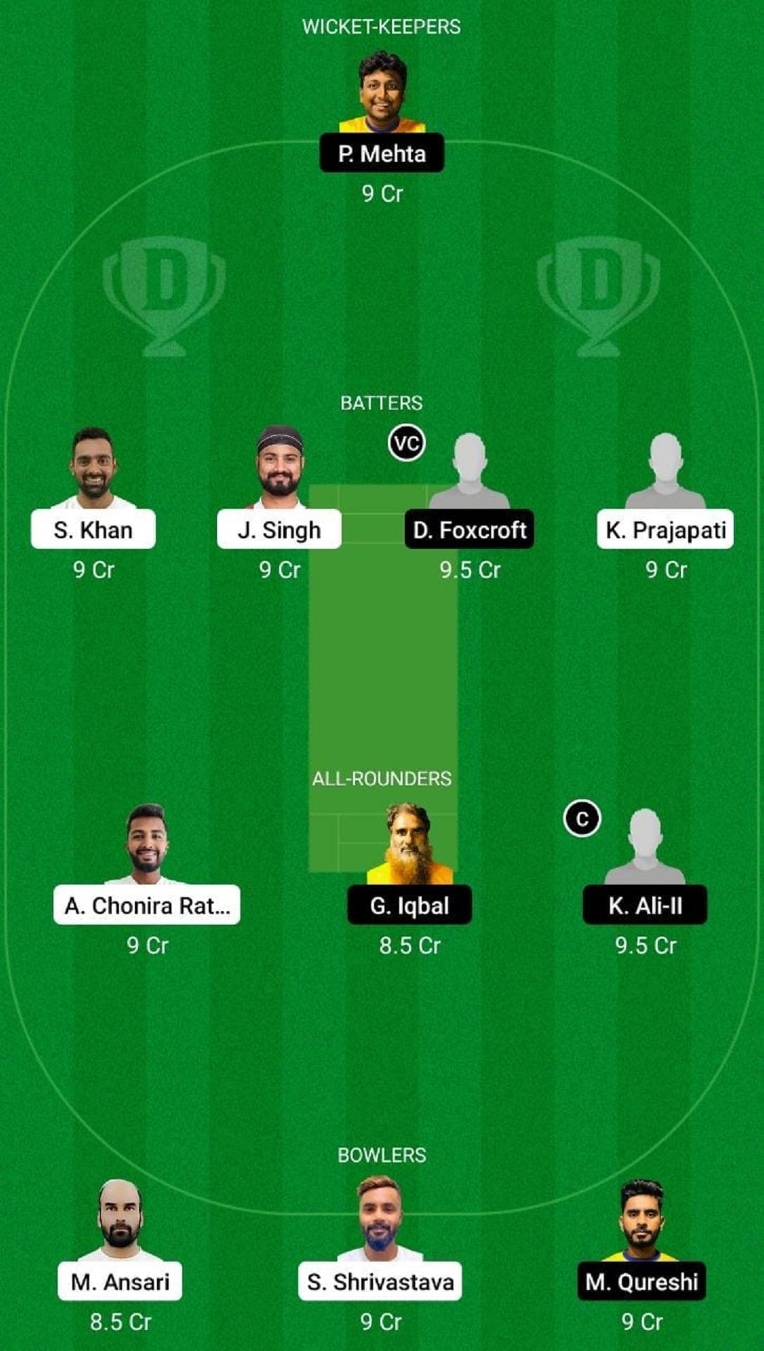Fantasy Suggestion #1: P Mehta, D Foxcroft, K Prajapati, J Singh, S Khan, K Ali, G Iqbal, A Chonira Rathan, M Qureshi, S Shrivastava, M Ansari.