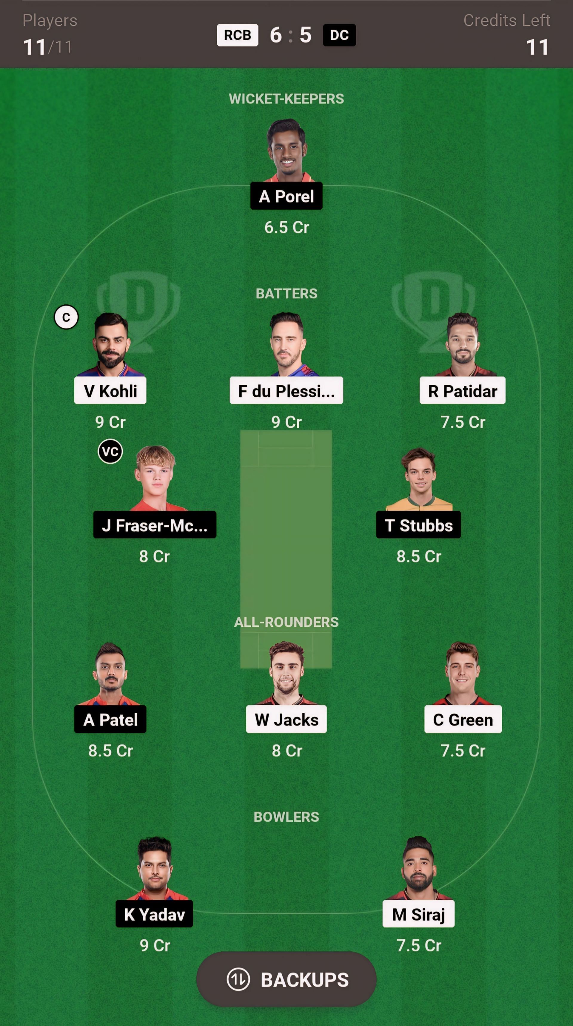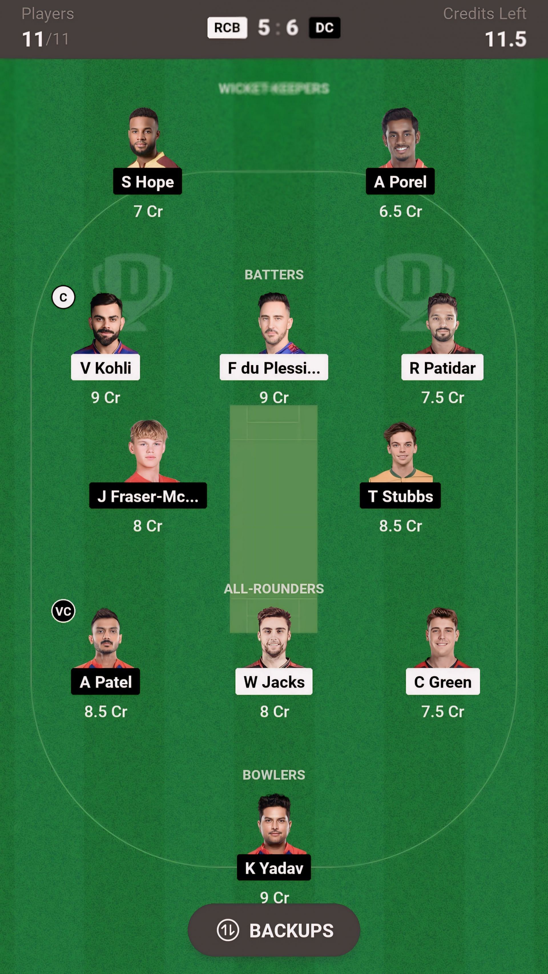 Batters: V Kohli, F du Plessis, R Patidar, J Fraser McGurk, T Stubbs