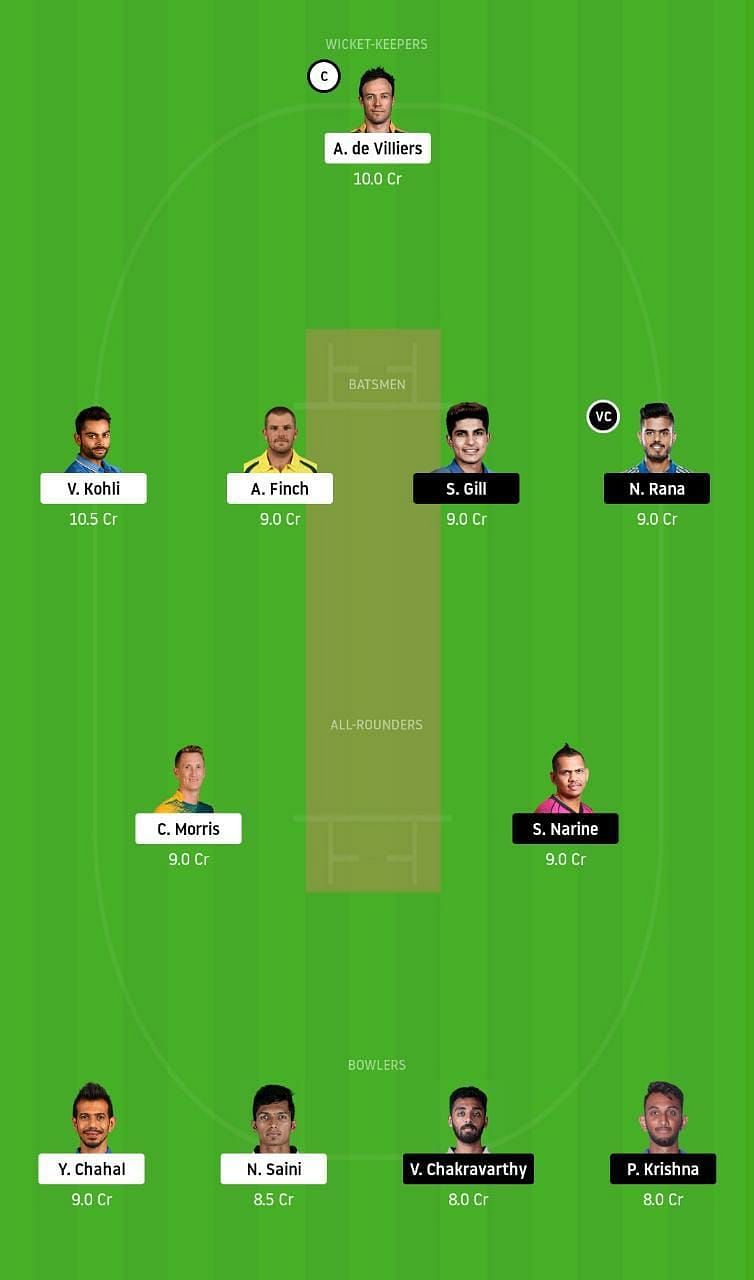 Fantasy Suggestion #1: AB de Villiers, Virat Kohli, Aaron Finch, Shubman Gill, Nitish Rana, Chris Morris, Sunil Narine, Yuzvendra Chahal, Navdeep Saini, Varun Chakravarthy and Prasidh Krishna