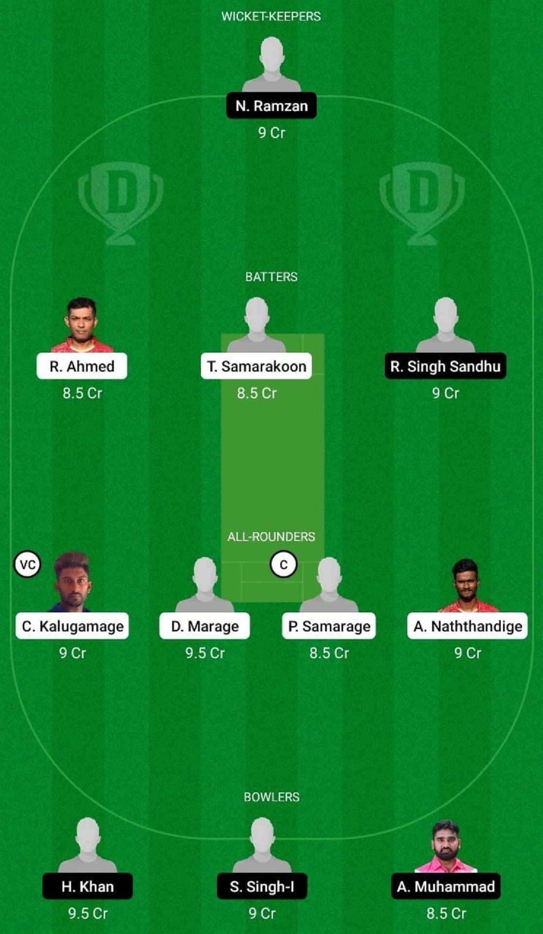 Fantasy Suggestion #1: N Ramzan, R Singh Sandhu, T Samarakoon, R Ahmed, P Samarage, C Kalugamage, A Naththandige, D Marage, H Khan, S Singh, A Muhammad