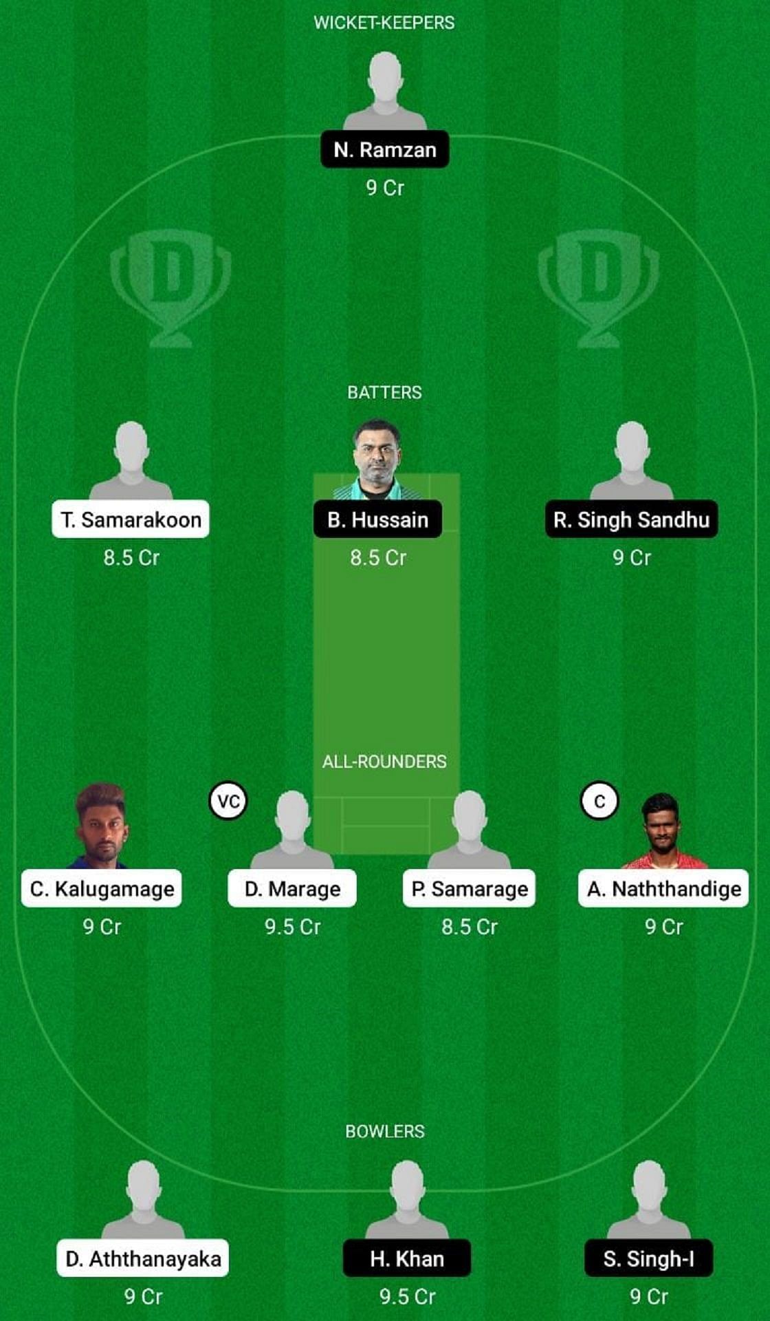 Fantasy Suggestion #2: N Ramzan, R Singh Sandhu, T Samarakoon, B Hussain, P Samarage, C Kalugamage, A Naththandige, D Marage, H Khan, S Singh, D Aththanayaka