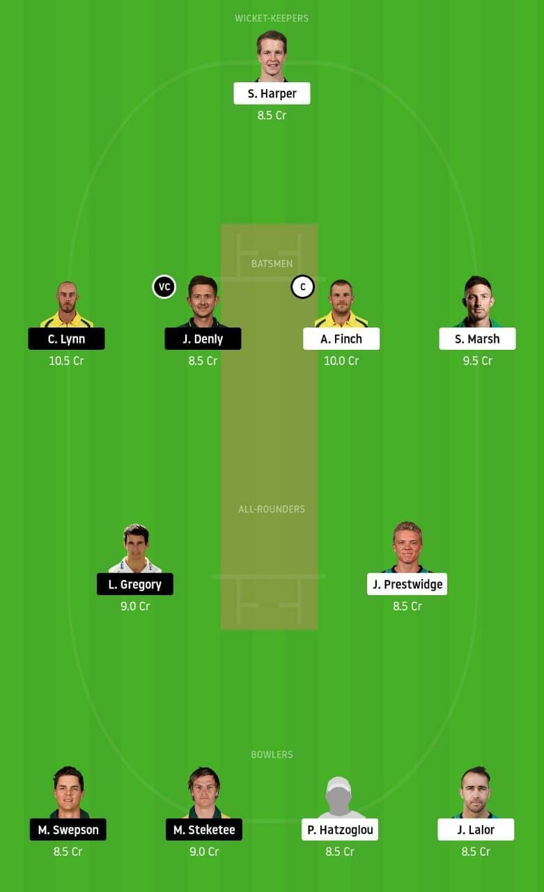 Fantasy Suggestion #1: Sam Harper, Chris Lynn, Joe Denly, Aaron Finch, Shaun Marsh, Lewis Gregory, Jack Prestwidge, Mitch Swepson, Mark Steketee, Peter Hatzoglou and Josh Lalor.