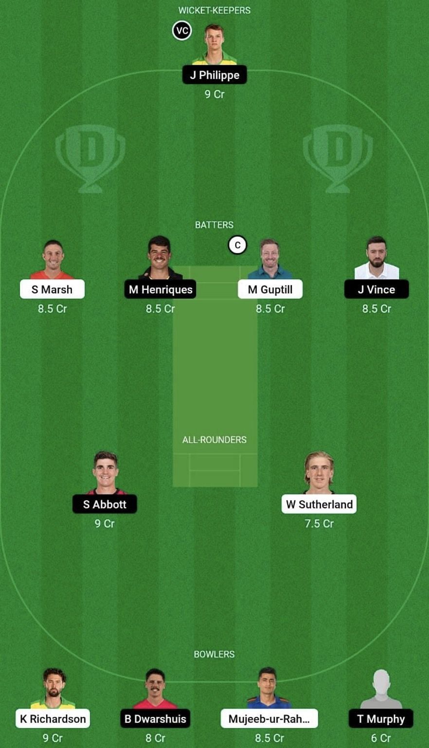 Batters: Shaun Marsh, Moises Henriques, Martin Guptill (c), James Vince