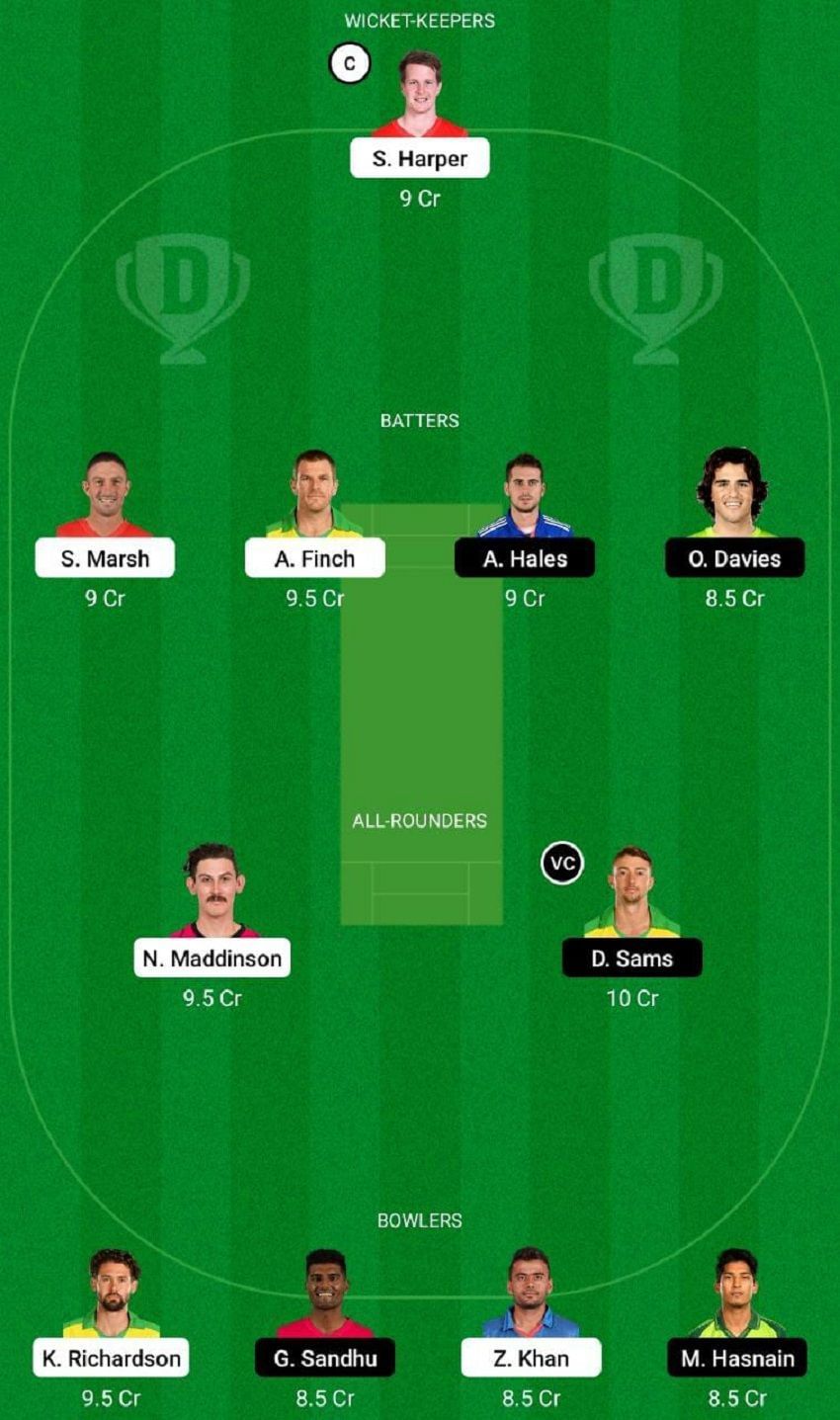 Fantasy Suggestion #2: Sam Harper, Shaun Marsh, Alex Hales, Aaron Finch, Oliver Davies, Nic Maddinson, Daniel Sams, Kane Richardson, Gurinder Sandhu, Zahir Khan and Mohammad Hasnain