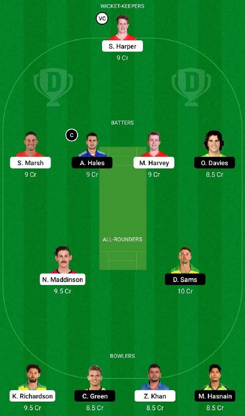 Fantasy Suggestion #1: Sam Harper, Shaun Marsh, Alex Hales, Mackenzie Harvey, Oliver Davies, Nic Maddinson, Daniel Sams, Kane Richardson, Chris Green, Zahir Khan and Mohammad Hasnain