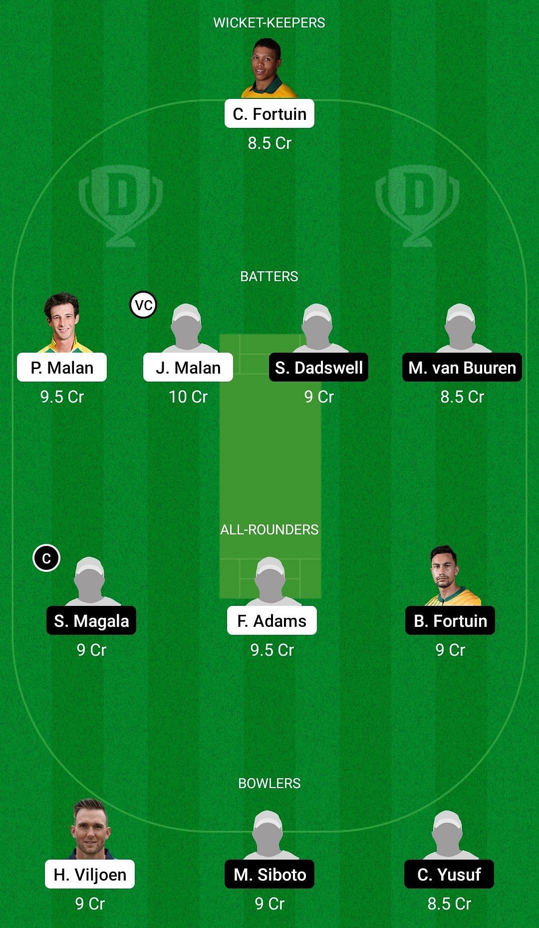 Fantasy Suggestion #1: Clyde Fortuin, Pieter Malan, Janneman Malan, Shane Dadswell, Mitchell Van Buuren, Sisanda Magala, Ferisco Adams, Bjorn Fortuin, Hardus Viljoen, Malusi Siboto, Codi Yusuf