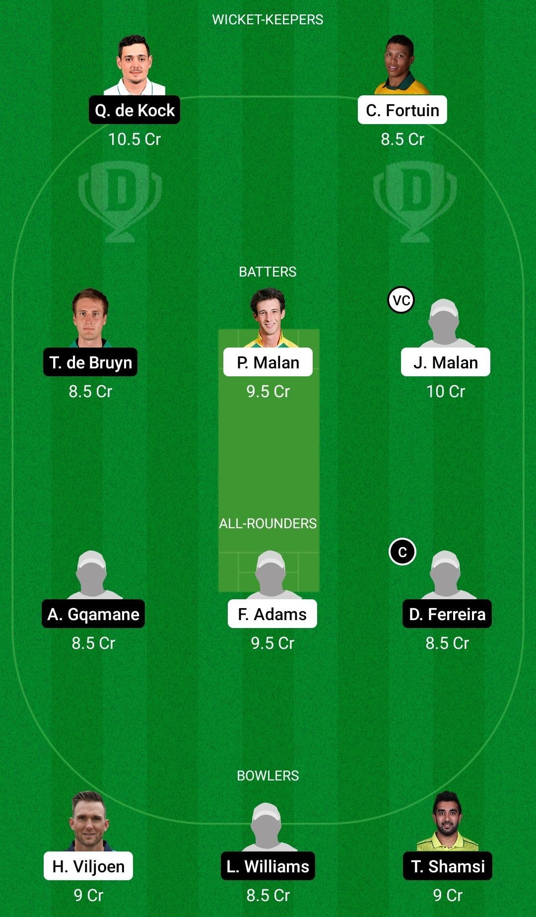 Fantasy Suggestion #2: Quinton de Kock, Clyde Fortuin, Theunis de Bruyn, Pieter Malan, Janneman Malan, Ayabulela Gqamane, Ferisco Adams, Donavon Ferreira, Hardus Viljoen, Lizaad Williams, Tabraiz Shamsi
